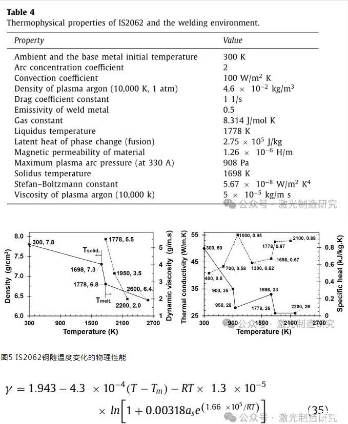 表4顯示了在該模擬中應用的IS2062鋼的熱物理性質(zhì)。在溫度相關條件下考慮了相變和合金元素對不同物理性質(zhì)的影響(圖5)。這些特性是從不同的數(shù)據(jù)庫中收集的,包括FLOW-3D的流體數(shù)據(jù)庫和其他關于低碳鋼的文獻。自由表面的表面張力被定義為假二元Fe–S系統(tǒng)中溫度和硫含量的函數(shù):