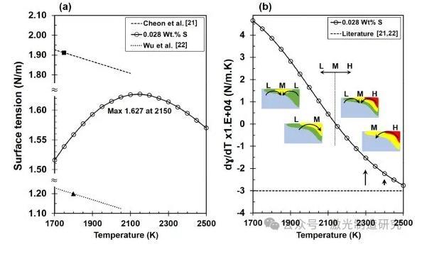圖6表面張力(a)及其梯度(b)是溫度和硫重量%的函數(shù)。關于中間范圍(M)的轉(zhuǎn)變溫度,高溫和低溫分別用字母H和L標記