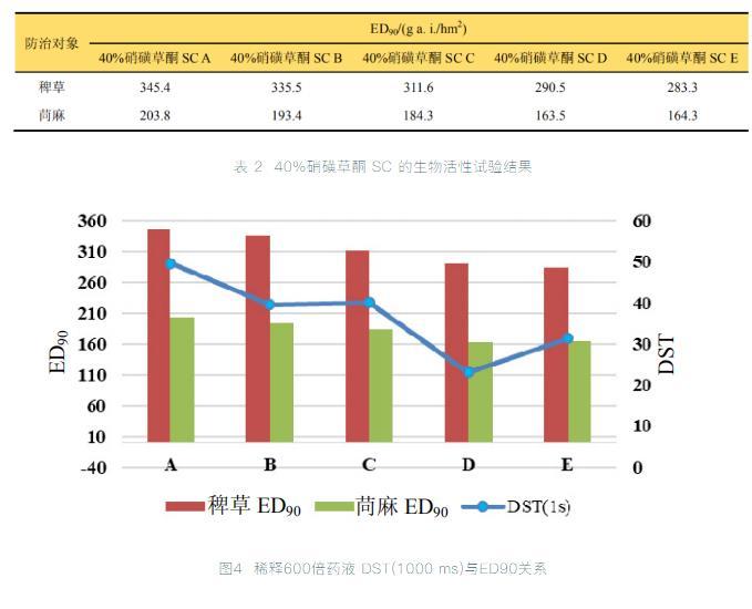 通過對(duì)480 g/L硝磺草酮懸浮體系制劑的研究,進(jìn)而測(cè)定5個(gè)不同制劑配方的3種稀釋濃度液的動(dòng)態(tài)表面張力,研究防治效果與動(dòng)態(tài)表面張力的關(guān)系。結(jié)果顯示無論對(duì)禾本科還是闊葉雜草,懸浮體系藥液的動(dòng)態(tài)表面張力的變化趨勢(shì),在一定程度上與其藥效正相關(guān)。