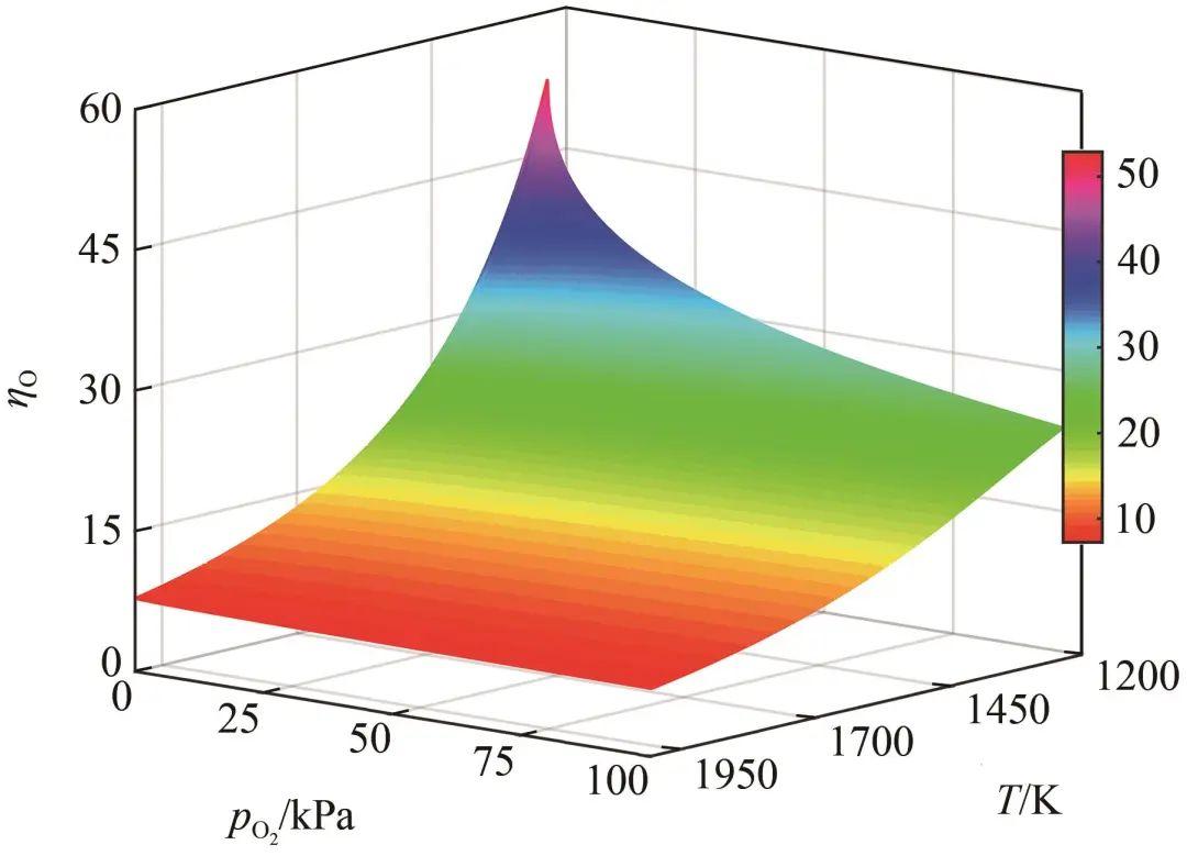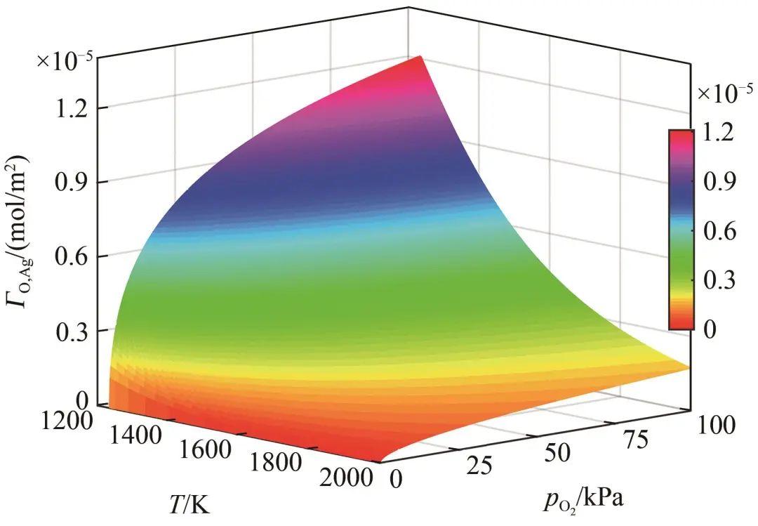 由圖7可知,當(dāng)溫度低于1500 K時,ΓO,Ag隨氧氣壓力升高顯著增加;當(dāng)溫度高于1500 K時,由于液態(tài)Ag-O系中的氧溶解度顯著降低,ΓO,Ag隨氧氣壓力的增加,其增加幅度減小。觀察圖8可知,η隨著溫度和氧分壓的升高而呈現(xiàn)下降趨勢。這是因為式(27)中的表面偏析平衡系數(shù)KII與溫度呈負(fù)相關(guān),當(dāng)溫度升高時KII減小,導(dǎo)致表面氧濃度降低。此外,在較低的氧分壓條件下,O原子傾向富集于表面;當(dāng)氧分壓升高時,更多的O原子溶入液態(tài)Ag-O系中,引起η減小。