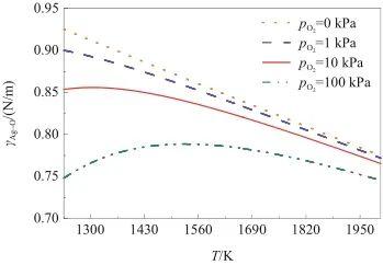 圖6研究了在不同氧氣壓力條件下,γAg-O隨溫度的變化關(guān)系。由圖可知,當(dāng)氧氣壓力低于10 kPa時,γAg-O與溫度呈負(fù)相關(guān)。而當(dāng)氧氣壓力高于10 kPa時,隨著溫度升高,γAg-O呈現(xiàn)先增大后減小的趨勢,并且隨著氧氣壓力增加,這種轉(zhuǎn)變幅度增大。這是因為γAg-O受溫度和氧溶解度的共同影響。一方面,隨著溫度升高,液態(tài)Ag的表面張力(γAg)降低,從而導(dǎo)致γAg-O降低;另一方面,液態(tài)Ag-O系中的氧溶解度與溫度呈負(fù)相關(guān),當(dāng)溫度升高時氧溶解度下降,導(dǎo)致表面氧吸附量減少,進(jìn)而引起γAg-O增加。因此,當(dāng)溫度較低時,氧溶解度成為影響γAg-O的主要因素;而在較高的溫度條件下,溫度成為主要因素。