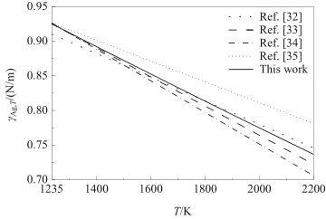 根據(jù)式(7),計算了液態(tài)Ag的表面張力γAg,T,結(jié)果如圖3所示??傮w上,隨著溫度的升高,γAg,T呈現(xiàn)近似線性下降的趨勢。從圖中可以看出,γAg,T的預(yù)測值與文獻(xiàn)[32-34]具有較好的一致性,但略低于文獻(xiàn)[35]。