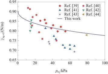 根據(jù)式(33),計算了1350 K下液態(tài)Ag-O系的表面張力γAg-O,并將計算結(jié)果與文獻(xiàn)數(shù)據(jù)[39-44]進(jìn)行比較,如圖5所示。觀察圖5可知,γAg-O與氧氣壓力呈負(fù)相關(guān)。在較低的氧氣壓力下,γAg-O的下降幅度比較顯著;而隨著氧氣壓力增加,γAg-O的下降幅度逐漸減小。另外,計算結(jié)果與文獻(xiàn)[39,40,44]吻合良好,但高于文獻(xiàn)[41-43]。這種差異是可以接受的,因為所采用模型僅考慮了溫度和氧氣壓力,而在實驗過程中,系統(tǒng)的表面張力不可避免地受到雜質(zhì)的影響。