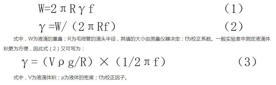 滴體積法的基本原理是這樣的,利用毛細(xì)管滴頭,緩慢往下滴液體,這時候測量液滴的大小,就能測定液體的表面張力。這是因為液體的表面張力,與從毛細(xì)管滴下的液滴的大小有內(nèi)在關(guān)聯(lián),存在正比關(guān)系,這個關(guān)系可以用數(shù)學(xué)公式表達(dá):