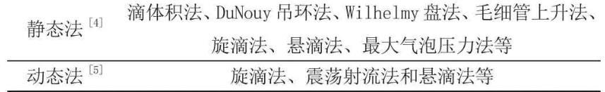 液體表面張力可以通過儀器測定,目前測定方法大體上分為動態(tài)法和靜態(tài)法。這兩大類方法下面由于細(xì)分,具體分類如表1。