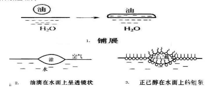 第二種方式,鋪展方式。在上述的液-固界面的潤濕作用,液體在固體表面的鋪展也可以引用到液液界面,不過此時(shí)的鋪展過程復(fù)雜一些。比如在清潔的水面上,滴加不溶性“油”滴,此時(shí)的“油”在水面上,可能表現(xiàn)出三種不同的狀態(tài):