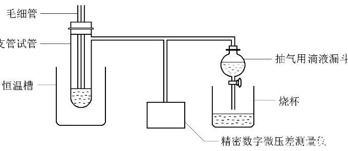 儀器:AF-02型數(shù)字式微壓測量儀,數(shù)控恒溫槽,5mL和10mL移液管各一支,堿式滴定管1支,50mL容量瓶9個,樣品管1個,毛細(xì)管1個,抽氣瓶1個,錐形瓶1個,玻璃漏斗1個。