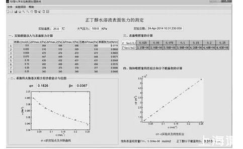借助MATLAB工程計(jì)算平臺,通過程序設(shè)計(jì)完成了“正丁醇水溶液表面張力的測定”應(yīng)用軟件的開發(fā)。在完成錄入壓差實(shí)驗(yàn)數(shù)據(jù)后,不僅可以自動計(jì)算和填入溶液的表面張力,還能夠?qū)崿F(xiàn)溶液表面張力與濃度定量關(guān)系的希斯科夫斯基經(jīng)驗(yàn)方程(Szyszkowski′s equation)中待估參數(shù)的求解,并用以求導(dǎo)供給吉布斯公式計(jì)算溶液的吸附量,進(jìn)而推算溶液飽和吸附量和正丁醇分子的截面積。軟件的操作過程簡便、直觀、高效,避免了人工數(shù)據(jù)處理、繪圖的煩瑣和人為誤差,可提高實(shí)驗(yàn)結(jié)果的準(zhǔn)確性和重現(xiàn)性。