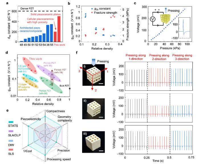 為進一步闡述所開發(fā)的STATS制造工藝的優(yōu)異性,研究團隊制備了一系列經(jīng)過三維結(jié)構(gòu)設(shè)計的多孔壓電陶瓷,并對其機械性能和壓電性能進行了表征(圖2)。STATS法加工的多孔壓電陶瓷具有整體多孔但局部致密的特點,即使在相對密度(多孔陶瓷與實心塊體陶瓷的密度比值)較低的情況下(0.13-0.34),也能具有較高的斷裂強度(1.0-3.9 MPa)和壓電常數(shù)d33(200 pC N-1)。為進一步評估壓電陶瓷超材料的壓電響應(yīng),研究團隊基于由周期性結(jié)構(gòu)單元組成的有機骨架制備了一系列具有不同三維結(jié)構(gòu)的多孔壓電陶瓷,該方法加工的壓電陶瓷展示出優(yōu)異的壓電響應(yīng)和各向異性。