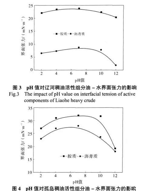 (3)pH值對(duì)遼河稠油活性組分的油-水界面張力的影響總體上略大于對(duì)孤島稠油活性組分的影響,且對(duì)瀝青質(zhì)的油-水界面張力的影響大于對(duì)膠質(zhì)的影響。即pH值對(duì)界面活性高的影響大。