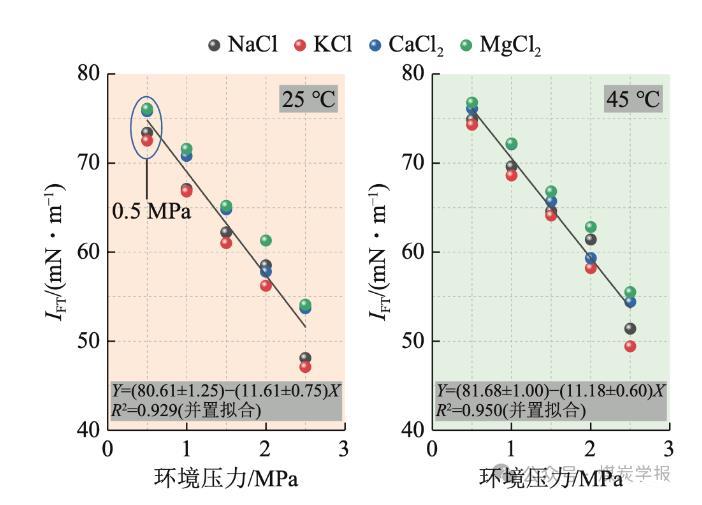 圖 4 不同離子溶液類型條件下 CO2?純水界面張力變化情況(礦化度統(tǒng)一為 1.5%)