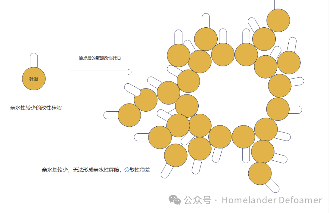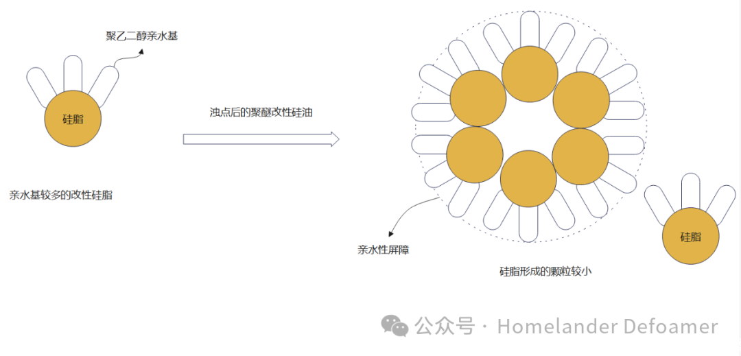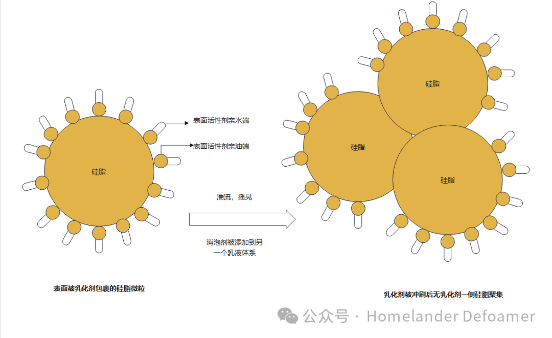 乳化劑既然很容易脫落,那么可以用化學(xué)鍵的方式,把乳化劑接枝在硅脂上,這樣即使析出,在沒(méi)有外加乳化劑和剪切力的情況下也能將析出的硅脂分散到體系中。這對(duì)親水基與親油基分子量的把控極其重要。若親水基太大,形成水包油的顆粒太小,雖然不析出。但是太小的微粒排液時(shí)間久,消泡速度就很慢。