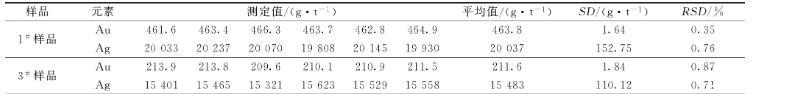選取兩個(gè)粗鉍樣品,1#和3#樣品進(jìn)行實(shí)驗(yàn),稱(chēng)取2.000 g粗鉍樣品,按照以上實(shí)驗(yàn)方法進(jìn)行實(shí)驗(yàn),每個(gè)樣品做了6次平行實(shí)驗(yàn),結(jié)果如表7所示,金相對(duì)標(biāo)準(zhǔn)偏差(RSD)為0.35%~0.87%,銀相對(duì)標(biāo)準(zhǔn)偏差(RSD)為0.76%~0.71%。