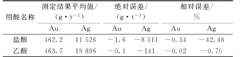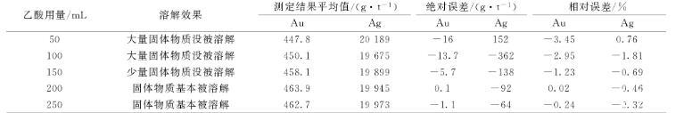 實(shí)驗(yàn)樣品金含量463.8 g/t,銀含量20 037 g/t,進(jìn)行除鉍用酸量的實(shí)驗(yàn),試驗(yàn)用酸為乙酸(1+1),結(jié)果見(jiàn)表5,從結(jié)果可以看出50、100 mL乙酸用量,大部分固體物質(zhì)沒(méi)被溶解,大部分鉍沒(méi)被除去,乙酸用量200 mL時(shí),固體物質(zhì)基本被溶解,結(jié)果較準(zhǔn)確,可以滿(mǎn)足測(cè)定要求。在結(jié)果準(zhǔn)確的情況下選擇用量少的,所以實(shí)驗(yàn)選擇乙酸用量為200 mL。