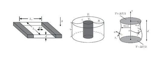 液層模型是源自于空間晶體生長實驗探索的簡化模型,是研究微重力條件下界面張力梯度驅(qū)動對流基本流動規(guī)律的經(jīng)典模型。液層模型主要包括矩形液層(rectangular pool)、環(huán)形液層(annular pool)和液橋(liquid bridge)(圖1)等。相對而言,液橋是一類特殊的液層模型。液橋中界面張力梯度驅(qū)動對流的流動穩(wěn)定性研究成果極為豐富,相關(guān)系統(tǒng)的完整臨界轉(zhuǎn)捩描述詳見綜述(Hu et al.2008)。除了極薄液層的情況,在絕大多數(shù)界面張力梯度驅(qū)動對流的地面實驗研究中,界面張力效應和重力效應間存在較強的耦合作用。