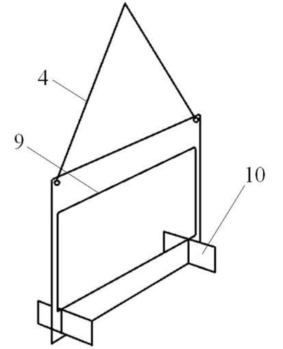 拉力框的設(shè)計(jì)是本次測(cè)試能否成功的關(guān)鍵之一,其結(jié)構(gòu)如圖3,與通用的拉力框有很大不同。其形狀如漢字中“口”字的形狀,由厚0.25mm薄鋁片制成。上部底緣稱(chēng)之為刀口(9),長(zhǎng)l=50mm,刀口與液面接觸后拉起液膜(2)。拉力框兩側(cè)各寬3mm,其作用是保持拉起的液膜的穩(wěn)定,使之不會(huì)過(guò)早斷裂。拉力框底部設(shè)有張開(kāi)的與框面垂直的翼片(10),可防止拉力框擺動(dòng)。拉力框通過(guò)輕軟細(xì)線懸掛于力敏傳感器(5)上,通過(guò)拉動(dòng)懸線(4),可調(diào)整拉力框與液面的平行度。