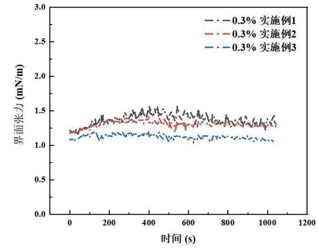 采用克呂士SDT旋轉滴界面張力儀分別測量原油(粘度723.7 mPa·s)滴入各實施例的地層水溶液后的界面張力(IFT),其中,各實施例在地層水中的質量濃度為0.3%,并將原油滴入地層水中作為對照組進行測量,測得對照組界面張力為21.6mN/m,其余各實施例測量結果如圖所示。可以看到,原油與三種實施例溶液混合后的體系的IFT可降低至1.25~1.46mN/m,證明了硅基納米原位乳化減阻劑具有良好的界面張力降低效果。