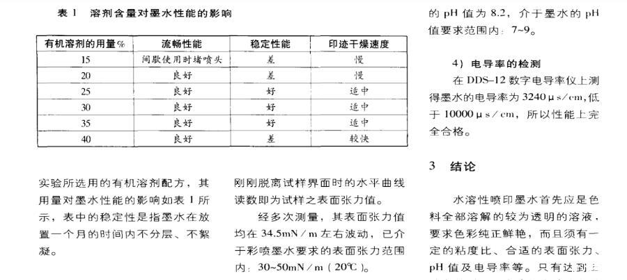 噴墨墨水中有機(jī)溶劑的成分及所占的比例對墨水的性能影響非常大。一般情況下,溶劑的用量是墨水重量的10%-50%。當(dāng)溶劑含量低于10%時,作用不明顯,超過50%時有些染料則無法溶解。