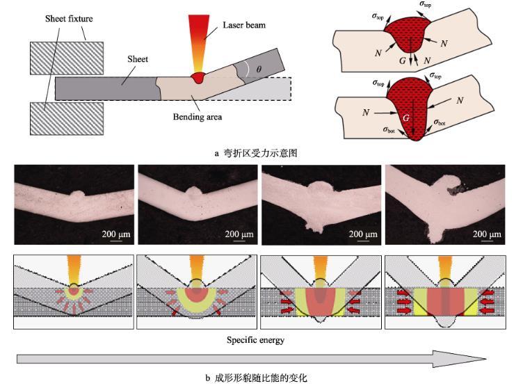 通過觀察激光熱應(yīng)力成形過程中彎折處的形貌發(fā)現(xiàn),激光熱輸入、彎曲角度和成形機制會影響彎折區(qū)材料表面的擠壓、熔化、流動和凝固過程,以及材料內(nèi)部的溫度梯度和界面表面張力,這些影響導(dǎo)致彎折區(qū)域的輪廓形貌、粗糙度、顯微組織、硬度分布發(fā)生變化。在激光熱應(yīng)力成形過程中,熔池的受力情況如圖1a所示。一方面,當比能較小且熔凝區(qū)僅存在金屬板上表面時,薄板彎折處的增厚主要受到左右兩側(cè)和下側(cè)冷端材料的約束作用,通過作用于上側(cè)材料,且上表面局部熔化的材料在頂端表面張力的作用下,形成了頂部凸起的形貌。同時,由于激光瞬態(tài)作用時間較短,熔融材料在激光掃描結(jié)束后快速凝固,并在掃描次數(shù)逐漸增加的過程中形成連續(xù)隆起的形貌,在彎折處形貌演變過程中粗糙度逐漸增大。在高比能下,薄板彎折處材料的熔化凝固和塑性變形受到左右兩側(cè)材料的橫向約束,該區(qū)域在左右兩側(cè)材料的擠壓下增厚。