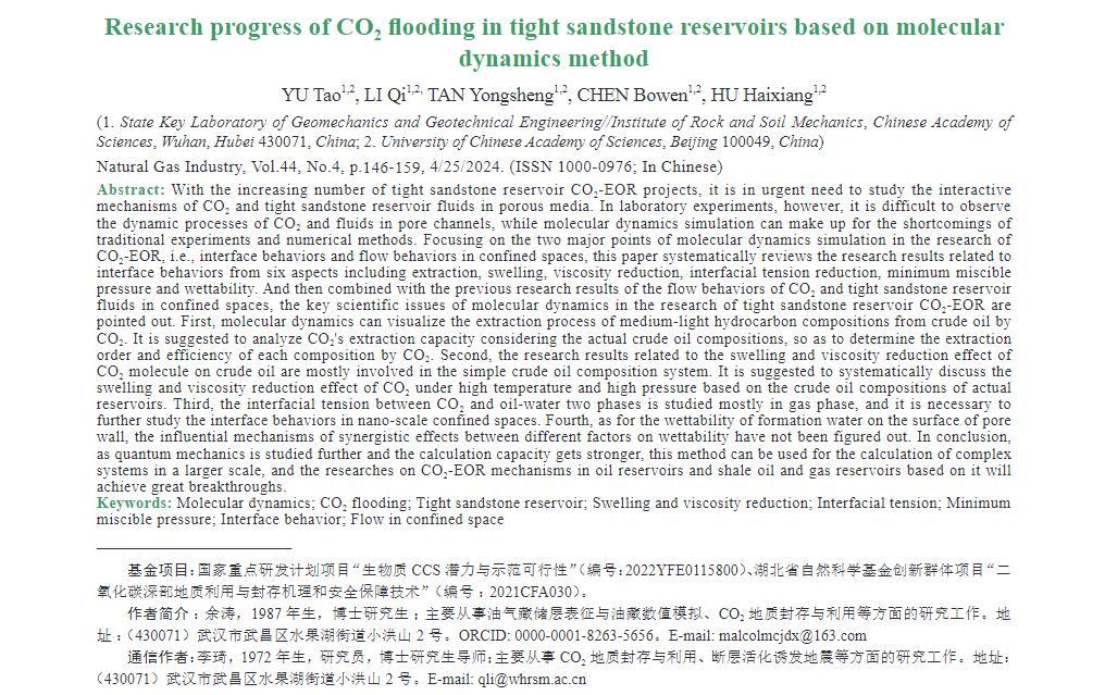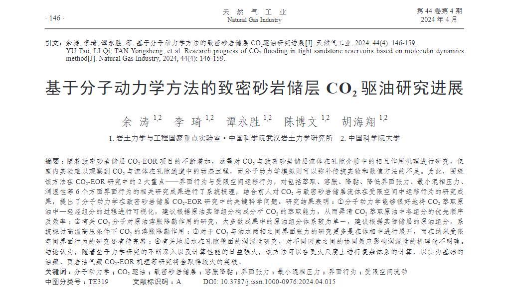 隨著致密砂巖儲層CO2-EOR項目的不斷增加,亟需對CO2與致密砂巖儲層流體在孔隙介質(zhì)中的相互作用機理進行研究,但室內(nèi)實驗難以觀察到CO2與流體在孔隙通道中的動態(tài)過程,而分子動力學(xué)模擬則可以彌補傳統(tǒng)實驗和數(shù)值方法的不足。為此,圍繞該方法在CO2-EOR研究中的2大重點——界面行為與受限空間運移行為,對包括萃取、溶脹、降黏、降低界面張力、最小混相壓力、潤濕性等6個方面界面行為的相關(guān)研究成果進行了系統(tǒng)梳理,結(jié)合前人對CO2與致密砂巖儲層流體在受限空間中運移行為的研究成果,提出了分子動力學(xué)在致密砂巖儲層CO2-EOR研究中的關(guān)鍵科學(xué)問題。