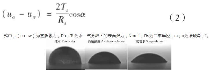 由上式可以看出,基質(zhì)吸力的大小與表面張力、接觸角和曲率半徑有關(guān)。其中,基質(zhì)吸力的大小與表面張力成正比,與彎液面曲率半徑成反比。因此,表面張力和曲率半徑的變化均會(huì)導(dǎo)致基質(zhì)吸力的改變。在環(huán)境溫度為25℃時(shí),通過(guò)JC2000型接觸角測(cè)量?jī)x對(duì)三種試樣的孔隙液體進(jìn)行接觸角測(cè)量。得到三種不同表面張力液滴的幾何形態(tài)圖如圖4所示,測(cè)量可得純水、酒精溶液和肥皂水對(duì)應(yīng)的接觸角分別為85°、65°和42°,而在25℃環(huán)境下,純水、20%酒精溶液、2 g L-1肥皂水的表面張力系數(shù)分別為:7.1×10-2N m-1、4.1×10-2N m-1、2.9×10-2N m-1。表面張力是決定彎液面形狀的主要因素之一,會(huì)影響曲率半徑和接觸角的大小。很顯然,表面張力大的液體接觸角變大,曲率半徑變小。圖4中水滴表面張力大于酒精溶液,但形成的彎液面半徑卻要小于酒精溶液,同樣的,酒精溶液形成的彎液面半徑又小于肥皂水。曲率半徑越小,土體中的基質(zhì)吸力越大??紫端砻鎻埩?huì)對(duì)彎液面的曲率半徑產(chǎn)生改變從而對(duì)基質(zhì)吸力產(chǎn)生影響,最終影響土壤的收縮開(kāi)裂。
