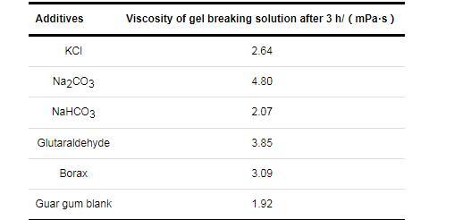 水基壓裂液是由多種不同的添加劑按比例配成的非均質(zhì)不穩(wěn)定化學(xué)體系。隨著壓裂技術(shù)的不斷發(fā)展,壓裂液體系也在不斷優(yōu)化。在實際的壓裂施工中,水基壓裂液的配方由于施工環(huán)境的不同,存在著較大的差異。本壓裂液配方選擇油田中常用的瓜爾膠作為稠化劑;選擇硼砂作為交聯(lián)劑;為了穩(wěn)定粘土礦物,選擇KCl作為粘土穩(wěn)定劑,以減少粘土礦物等對儲層滲透率造成的傷害;為了使壓裂液的性能更加穩(wěn)定,便于控制,還加入了一定量的Na2CO3和NaHCO3,作為pH調(diào)節(jié)劑。此外,從低成本的角度考慮,選擇戊二醛為殺菌劑,用來防止細(xì)菌滋生。