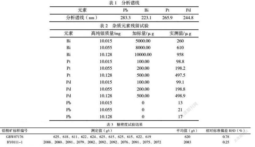 本方法中銀的含量是通過經(jīng)典重量法減去雜質(zhì)元素(鉛、鉍、鉑、鈀)和金所得,避免了高倍數(shù)的稀釋體積及苛刻環(huán)境要求帶來的誤差,分析結(jié)果準確穩(wěn)定、精密度高,適用于鉛精礦中銀含量的測定,滿足行業(yè)分析需求。