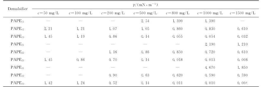 PAPE11、PAPE12和PAPE13是相對分子質(zhì)量相當(dāng)、HLB值逐漸增大,亦即其親水性逐漸增強(qiáng)的3個(gè)破乳劑樣品。從表3還可以看出,在同樣的破乳劑濃度下,HLB值越大的破乳劑降低油-水界面張力的幅度越大,油-水界面張力越低,甚至發(fā)生數(shù)量級的變化;而要將油-水界面張力降低至同樣的水平,HLB值大的破乳劑所需要的濃度則更低,即其降低油-水界面張力的效率越高。PAPE21、PAPE22和PAPE23以及PAPE31、PAPE32和PAPE332個(gè)系列的破乳劑隨著HLB值的增大也表現(xiàn)出同樣的規(guī)律。PAPE12、PAPE22和PAPE32是保持HLB值相當(dāng)、相對分子質(zhì)量逐漸增大的3個(gè)破乳劑樣品,隨著相對分子質(zhì)量的增大,它們降低油-水界面張力的能力均有所增強(qiáng),但增強(qiáng)的幅度不大,大體均在同一數(shù)量級內(nèi)變化。PAPE13、PAPE23和PAPE33是水溶性最好的一組破乳劑,隨著相對分子質(zhì)量的增大,其降低油-水界面張力的能力也有所增強(qiáng),但增強(qiáng)幅度仍然不大。由此可見,在所研究的破乳劑相對分子質(zhì)量變化范圍內(nèi),相對分子質(zhì)量變化對PAPEmn界面活性的影響較小。