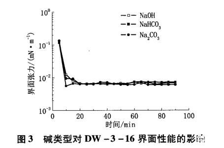 圖3堿類型對(duì)DW-3-16界面性能的影響