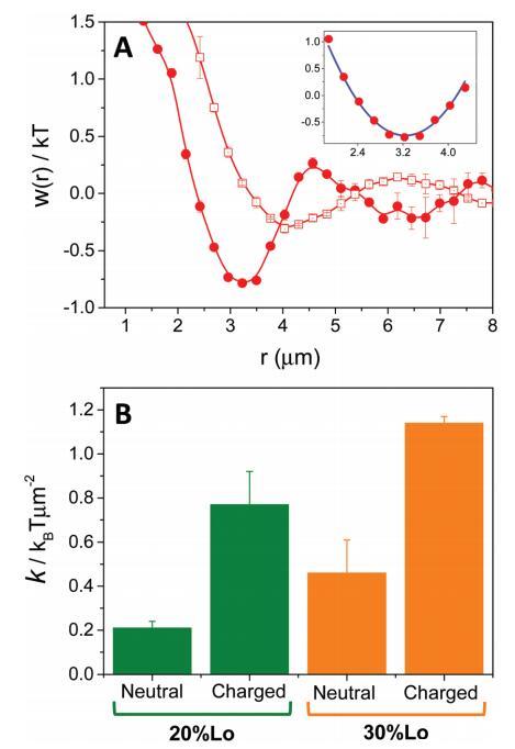圖 4 (A) 域之間的平均力勢 w(r) 從 由帶電(圓圈)或 中性(正方形)域。 插圖:擬合實(shí)驗(yàn)的例子 數(shù)據(jù)(藍(lán)色曲線)對應(yīng)于 20%Lo 的帶電域。 (B) 春天 諧波電位常數(shù),通過擬合 w(r) 的第一個谷值獲得 為中性和帶電雙層的二次函數(shù)(見 A 中的插圖) 以指定的液體順序百分比。