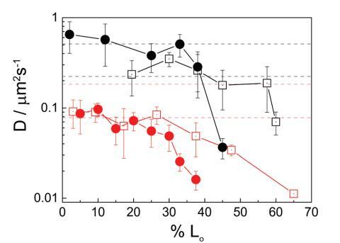 圖 2 擴(kuò)散系數(shù)(D)的實(shí)驗(yàn)值 小域 (1–3 mm) 作為面積百分比的函數(shù) 由液體有序相。 正方形代表中性系統(tǒng)和 環(huán)繞帶電系統(tǒng)。 黑色符號對應(yīng) 氣水界面處的單層和雙層的紅色符號。 虛線對應(yīng)于計算的 Dt 值的范圍 域大小的范圍,使用方程 (2) 或 (3)。 實(shí)線只是畫的 引導(dǎo)眼睛。