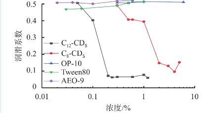 表面活性劑濃度是影響體系潤(rùn)滑性能的重要原因之一。單一濃度無法全面系統(tǒng)地評(píng)價(jià)表面活性劑的潤(rùn)滑性能,因此,進(jìn)一步探究表面活性劑濃度對(duì)潤(rùn)滑性能的影響,測(cè)定了不同濃度的5種表面活性劑在硅酸鈉水溶液中的潤(rùn)滑系數(shù),如圖1所示。