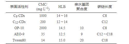 硅酸鈉(模數(shù)2.51,50.1°Bé),聚氧乙烯型表面活性劑OP-10、AEO-9、Tween 80(AR)。5種不同表面活性劑的理化性質(zhì)和化學(xué)結(jié)構(gòu)式見表1。其中,CMC為表面活性劑在水中的臨界膠束濃度,HLB為表面活性劑的親水親油平衡值。