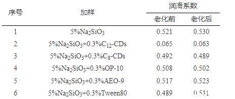 由表2可知,C12-CDs具有優(yōu)異的潤(rùn)滑效果,可顯著改善硅酸鹽水溶液的潤(rùn)滑性能,將潤(rùn)滑系數(shù)從0.521降低至0.065,潤(rùn)滑系數(shù)降低率高達(dá)87.52%,經(jīng)高溫老化后其潤(rùn)滑系數(shù)進(jìn)一步降低,表明C12-CDs能夠耐高溫耐強(qiáng)堿,與硅酸鹽配伍性良好,而碳鏈相對(duì)較短的C8-CDs對(duì)硅酸鹽水溶液并沒有表現(xiàn)出明顯的潤(rùn)滑效果。