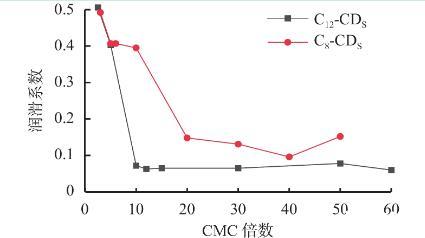 C12-CDS和C8-CDs的潤(rùn)滑效果存在明顯差異,兩者疏水烷基鏈長(zhǎng)度不同,而烷基鏈長(zhǎng)度可影響表面活性劑的表界面活性以及膠束的形成,推測(cè)是CDs形成的膠束在潤(rùn)滑過程中發(fā)揮作用,由此進(jìn)一步探究CDs的膠束對(duì)潤(rùn)滑性能的影響,圖2是CDs的硅酸鈉溶液潤(rùn)滑系數(shù)與2種CDS各自的CMC倍數(shù)的關(guān)系曲線。