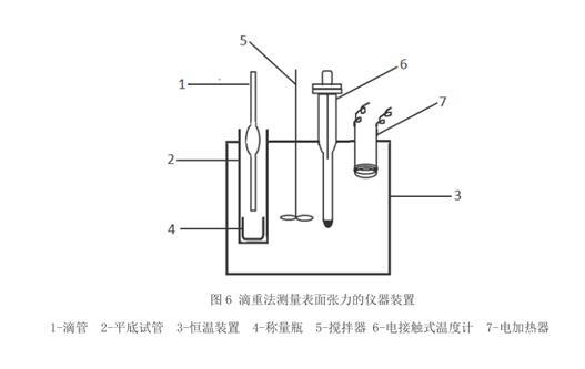滴重法是利用液滴重量與支持它的表面張力的力相平衡進(jìn)行測定的試驗(yàn)。主要也是因?yàn)楸砻鎻埩εc液滴重量、滴管半徑、液體密度及重力加速度相關(guān)。滴重法要使用到的儀器主要玻璃滴管、恒溫裝置、平底試管、稱量瓶、攪拌器、電接觸式溫度計(jì)、電加熱器等。試驗(yàn)步驟也是先配置測定溶液,清洗測量儀器,然后安裝好實(shí)驗(yàn)裝置,啟動(dòng)攪拌器,調(diào)節(jié)接觸溫度計(jì),至所需溫度,使水恒溫半小時(shí),要求普通溫度計(jì)的誤差不超過±0.5 ℃。恒溫足夠時(shí)間以消除平底試管內(nèi)與水溫的差,一般溫差小于 1 ℃。用分析天平稱得潔凈干燥的稱量瓶空瓶重。放入浸入恒溫裝置的平底試管內(nèi)。將橡皮管套于移液管的未加工端,用吸球?qū)⒋郎y液吸入移液管內(nèi),用夾子夾住橡皮管不使待測液滴下然后將移液管垂直懸掛入恒溫裝置內(nèi)的試管中,但不可與稱量瓶接觸。恒溫半小時(shí)后,慢慢旋開夾子,讓液體自然滴下,調(diào)節(jié)水滴的下落速度至每滴 100-120 s。至20 滴時(shí)擰緊夾子,取出移液管。將稱量瓶稱重,減去空的稱量瓶重量,求得每液滴的重量。在同一溫度下重復(fù)兩次。對(duì)于表面張力能隨時(shí)間迅速變化的或者界面能夠迅速相互飽和的界面,測定精度為±0.1%。