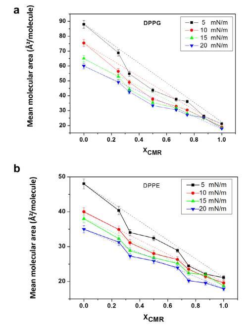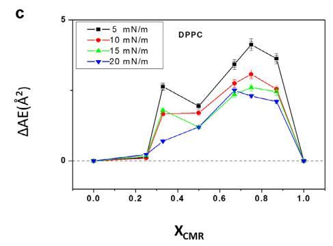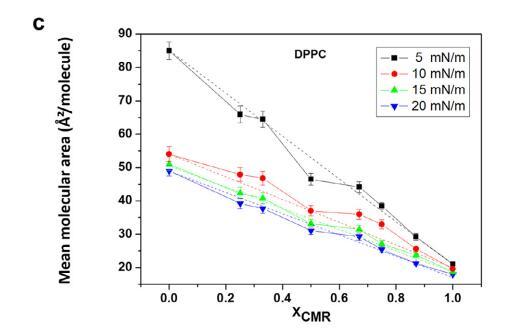 純和混合單層的 pA 等溫線與分子面積的關(guān)系如圖 1 所示。CMR/DPPG 等溫線顯示出與純 DPPG 脂質(zhì)相似的趨勢(圖 1a)。 相似相 對所有 CMR/DPPG 混合物都觀察到了轉(zhuǎn)變。 DPPG 和 DPPC 顯示崩潰壓力 (DPcoll) 為 52 mN.m-1 次方和 60 mN.m-1次方 , 分別。 一個過渡 (p ffi 3 mN.m-1次方 ) 從液體 發(fā)現(xiàn)純 DPPE 單層膨脹為凝聚相 與 D. coll 在 ffi55 mN.m-1次方 . 為 D. coll 獲得的值 純脂質(zhì)與文獻(xiàn)一致(Vollhardt 等人, 2000; 諾沃塔斯卡等人,2014 年)。