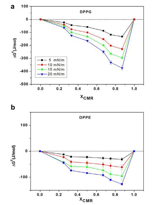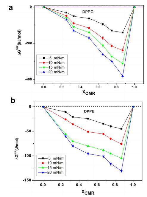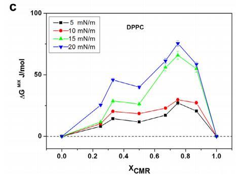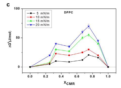 CMR/DPPG 混合膜的 ?Ge 和 ?Gmix 表示負(fù) 從 XCMR ≥ 0.25 到 XCMR = 1.0 的偏差(圖 7a 和 8a)。 ?Ge 和 ?Gmix 負(fù)值表明 CMR/DPPE 單層是 熱力學(xué)穩(wěn)定(圖 7b)。 ?Ge 和 ?Gmix 值為 DPPC 混合單層陽性,表明不混溶 (圖 7c 和 8c)。 分子之間的距離取決于 在導(dǎo)致排斥的磷脂頭部基團(tuán)上 互動(邁爾斯,1999 年;博格斯,1987 年)。