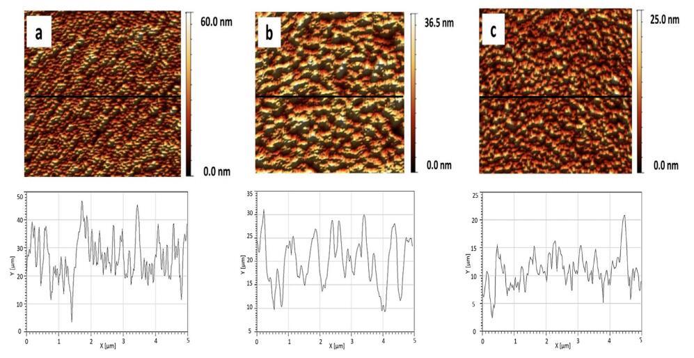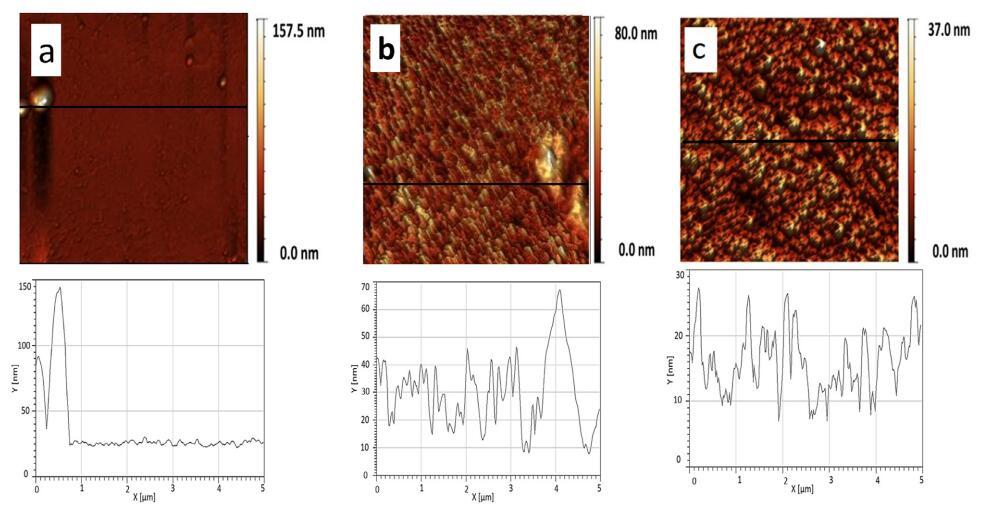 圖 9 顯示了純磷脂單層的 AFM 圖像 在 p = 20 mN/m 時轉(zhuǎn)移。 純磷脂顯示出均勻的 均方根 (rms) 等于 0.219 nm 的圖案, DPPG、DPPE 和 DPPC 分別為 0.060 nm 和 0.054 nm (圖 9)。 我們獲得了 rms ~ 0.045 nm (XCMR = 0.87) 相當(dāng)于 光滑的單層形貌(圖 10a)。 另一方面, CMR/DPPE 和 CMR/DPPC 薄膜對應(yīng)于粗糙表面 rms 分別為 0.1754 nm 和 0.072 nm(圖 10b 和 c)。 測量重復(fù)三次,rms 的標(biāo)準(zhǔn)偏差約為 5%。