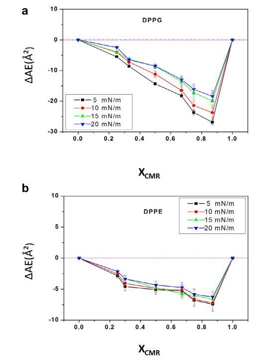 分子面積作為 CMR/ DPPG如圖5a所示。 可以看出負(fù)偏差 mma (XCMR = 0.33–0.67) 由于分子吸引力相互作用的增加。 CMR/DPPG 薄膜被認(rèn)為是部分混溶和非理想的浮動單層,因?yàn)榫€性度不高 觀察到的。 CMR/DPPE 混合薄膜的結(jié)果在 XCMR=0.25 和 0.67 時表現(xiàn)出不同的斷裂點(diǎn)(圖 5b)。 DAE 節(jié)目 包裝效率甚至幾何形狀的改進(jìn) 調(diào)節(jié)發(fā)生在較低的 XCMR(圖 6)(Andrade 等人, 2006; 周和張,2000)。