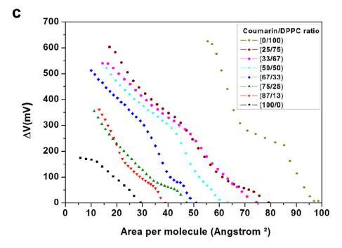 作為函數(shù)分子面積 (ΔVA) 的表面電位為 如圖3a所示。 為所有研究的磷脂獲得的 ?V 值 與之前的報(bào)告相似(Andrade et al., 2006; Nowotarska 等,2014)。 ?V(460 mV 至 275 mV)逐漸降低 對于 DPPG,觀察到 CMR 摩爾分?jǐn)?shù)的函數(shù)。 ?V 易受極性和非極性基團(tuán)的取向影響。