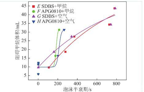 圖15為表面活性劑溶液泡沫中甲烷體積隨泡沫半衰期變化的曲線,半衰期包括甲烷泡沫半衰期和空氣泡沫半衰期。擬合度均在0.9以上,且均隨著泡沫穩(wěn)定性增強(qiáng),泡沫對(duì)甲烷的緩釋作用越強(qiáng)。