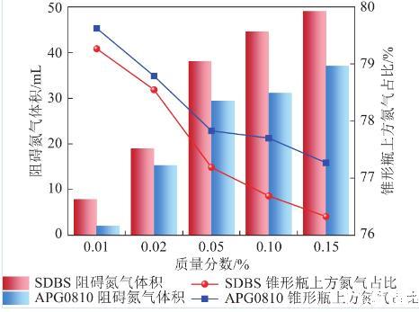 表面活性劑泡沫對(duì)氮?dú)饩忈屪饔媒Y(jié)果如圖11所示。相同質(zhì)量分?jǐn)?shù)下,SDBS溶液對(duì)氮?dú)獾木忈屝?yīng)優(yōu)于APG0810,質(zhì)量分?jǐn)?shù)為0.15%時(shí),SDBS和APG0810溶液泡沫阻礙氮?dú)怏w積分別為49.102 mL和37.042 mL。
