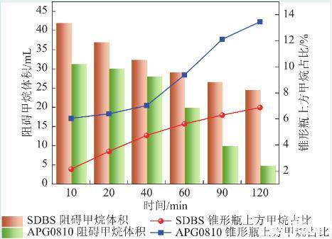隨著時(shí)間推移,兩種表面活性劑在通入甲烷氣體后產(chǎn)生的泡沫結(jié)構(gòu)均逐漸潰滅,對(duì)甲烷的緩釋效應(yīng)也逐漸衰弱。但由于兩種表面活性劑發(fā)泡性能和泡沫穩(wěn)定性不同的原因,SDBS泡沫結(jié)構(gòu)消散速率較慢,對(duì)甲烷的緩釋效應(yīng)衰減較慢。質(zhì)量分?jǐn)?shù)為0.15%APG0810溶液在60 min時(shí)對(duì)甲烷的緩釋效應(yīng)衰減到約為40%,而SDBS溶液在120 min時(shí)對(duì)約占通入甲烷總體積49.16%的甲烷仍有阻礙效應(yīng),該時(shí)刻APG0810泡沫結(jié)構(gòu)幾乎完全潰滅,對(duì)甲烷逸散無(wú)有效緩釋作用。
