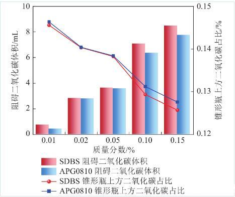 圖12為注入二氧化碳的氣相色譜檢測(cè)結(jié)果,計(jì)算出表面活性劑泡沫對(duì)二氧化碳的緩釋作用結(jié)果如圖12柱狀圖所示。相同質(zhì)量分?jǐn)?shù)下,SDBS溶液對(duì)二氧化碳的緩釋效應(yīng)優(yōu)于APG0810。然而兩種表面活性劑對(duì)二氧化碳緩釋效應(yīng)均不顯著,SDBS表面活性劑溶液在質(zhì)量分?jǐn)?shù)最大時(shí)10 min內(nèi)只控制了8.46 mL二氧化碳?xì)怏w,APG0810只控制了7.74 mL二氧化碳?xì)怏w。