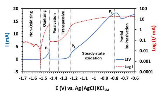 圖1電化學線性掃描伏安圖(LSV,藍色實線)及液滴電流的對數圖(紅色虛線),針對1 M NaOH中的鎵銦合金,掃描速率為0.5 mV/s。垂直虛線將圖中標記的六個反應區(qū)域區(qū)分開來,標記出三個氧化峰P1、P2和P3。