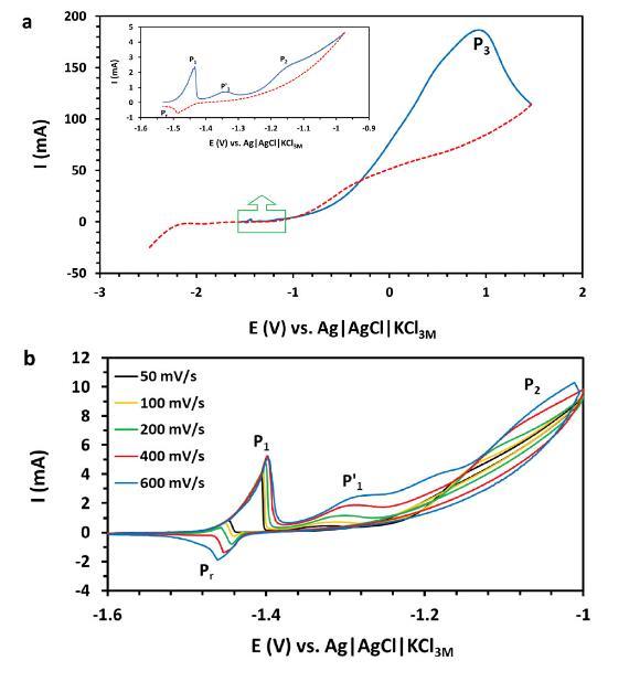 圖2(a)在300 mV/s掃描速率下,鎵銦合金液滴在1 M NaOH中的循環(huán)伏安圖。(b)不同掃描速率(50至600 mV/s)下的鎵銦合金液滴循環(huán)伏安圖。