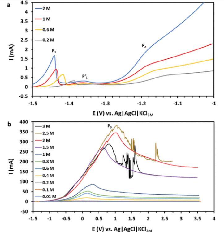 圖4(a)鎵銦合金在不同濃度NaOH中的近鈍化區(qū)伏安圖。(b)鎵銦合金在不同濃度NaOH中的完整線性掃描伏安圖,掃描速率為100 mV/s。