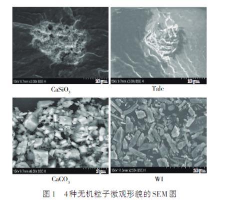 4種無機(jī)粒子的表觀形貌如圖1所示,可以看出,CaSiO3顆粒為多孔蜂窩狀結(jié)構(gòu),Talc顆粒形狀為偏平形,CaCO3顆粒形狀不規(guī)則,WI多為針狀形顆粒。