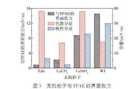 為深入評(píng)估4種無(wú)機(jī)粒子與TPAE之間的相容性,本研究采用界面張力儀、接觸角儀計(jì)算了4種無(wú)機(jī)粒子與TPAE之間的界面張力,以定量分析其相容性。如圖3所示,可以看出,Talc與TPAE之間的界面張力為0.82 mN/m,表明二者相互作用力較強(qiáng),能夠更好地相互滲透和混合,反映出二者之間存在良好的相容性。
